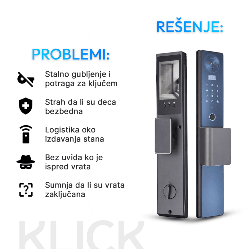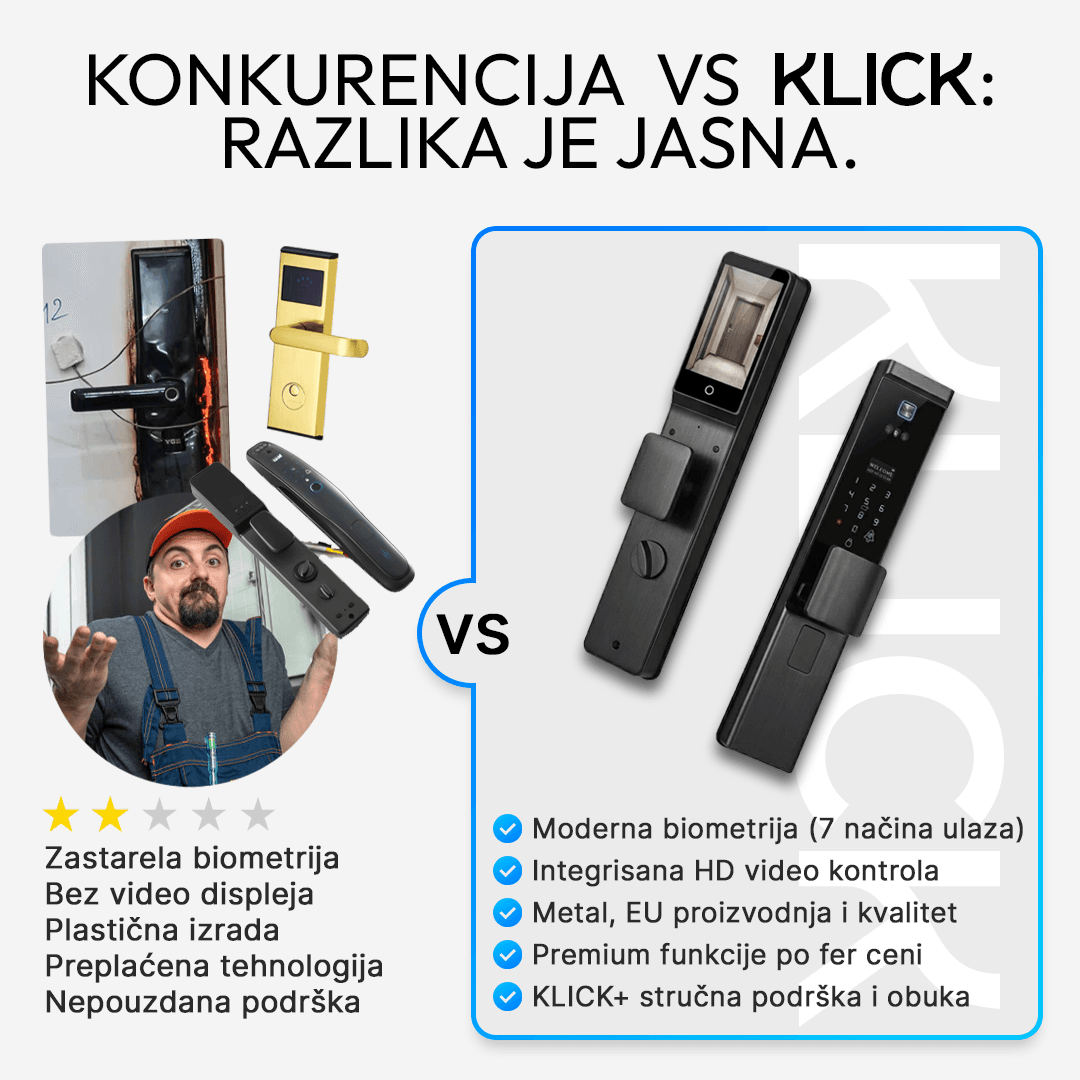 KLICK spaja vrhunske materijale i modernu biometriju u jedan siguran sistem. Integrisana video kontrola, direktna stručna podrška i evropski kvalitet — sve na jednom mestu.
